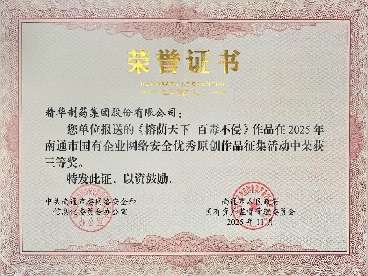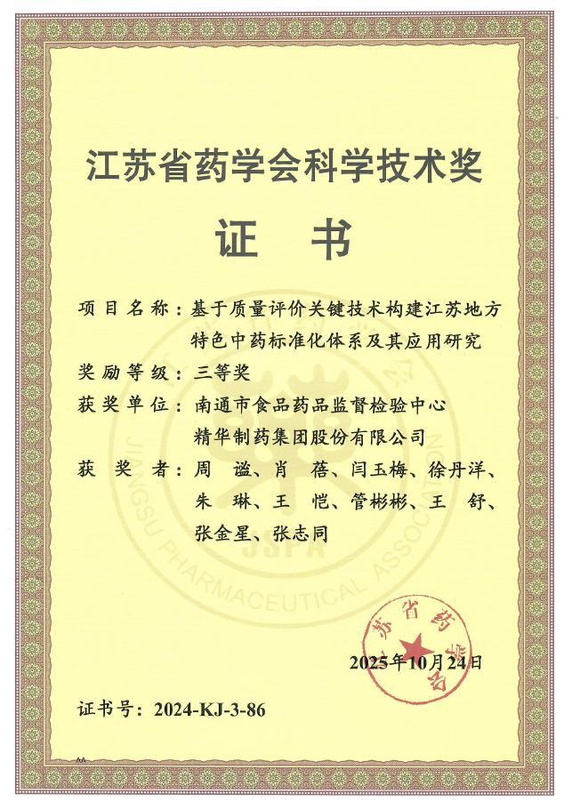 2025年11月22日,2025年江苏省药学大会暨第二十五届江苏省药师周在南京盛大召开。会上,隆重举行了2024年度江苏省药学会科学技术奖的表彰仪式。其中,精华制药集团携手南通市食品药品监督检验中心共同完成的《基于质量评价关键技术构建江苏地方特色中药标准化体系及其应用研…