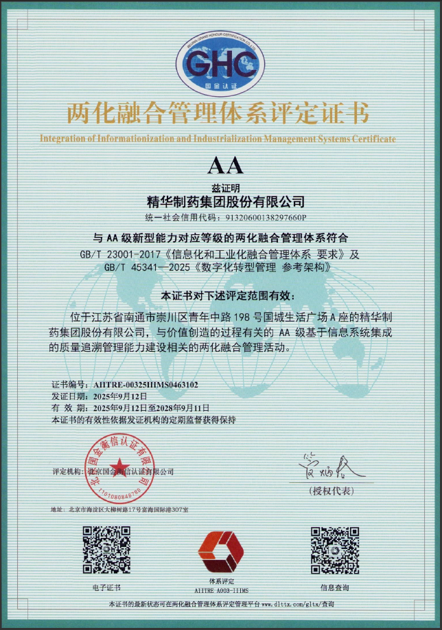 近日,精华制药顺利通过两化融合和数字化转型管理体系再评定,并获得两化融合和数字化转型管理体系AA级评定证书。此次 AA 级认证的落地,不仅是对企业信息化与工业化深度融合成效的权威认可,更有力推动了数字化技术在生产、管理、销售等各个环节的应用与优化,通过技术与业务…