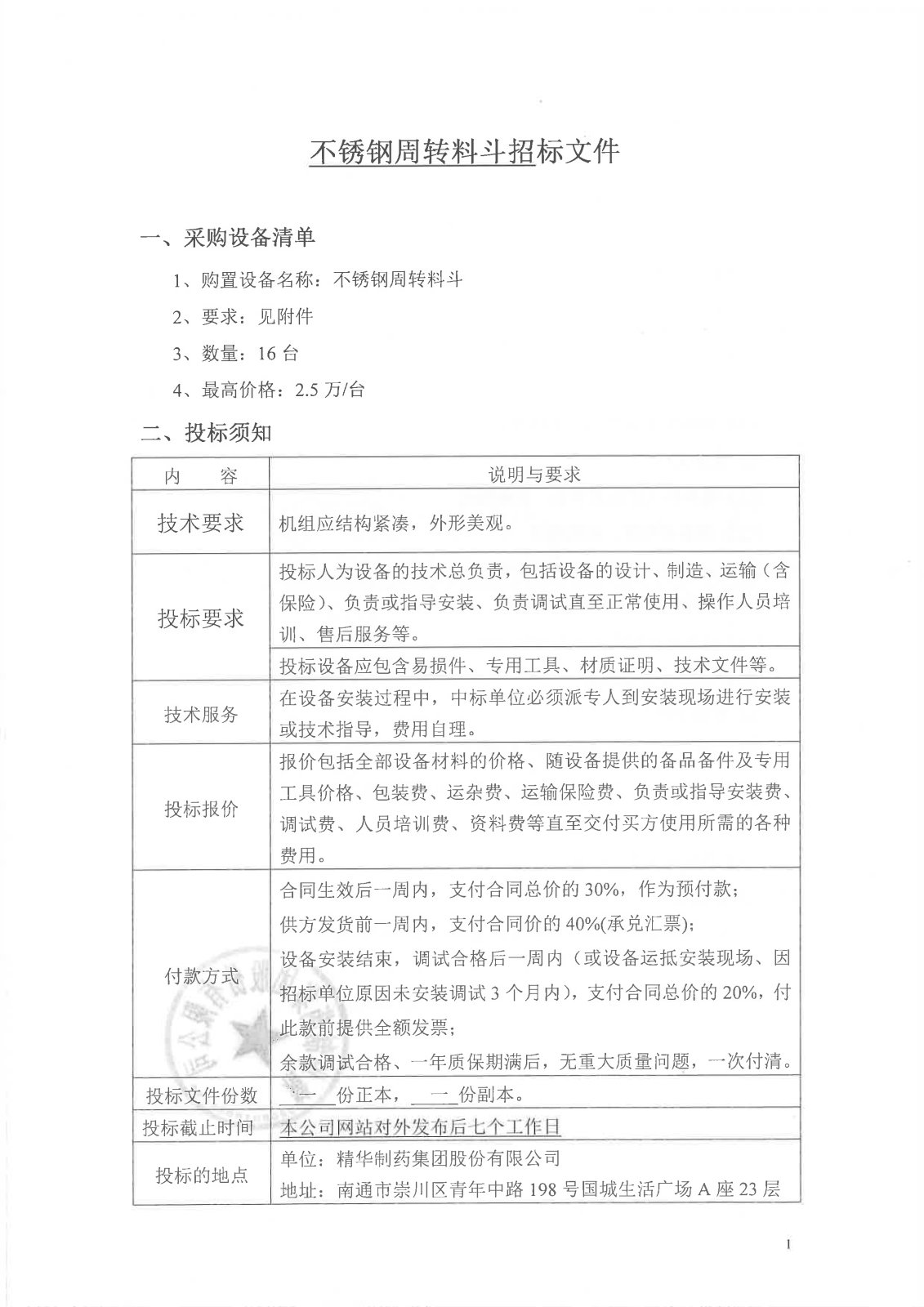 不锈钢周转料斗招标文件