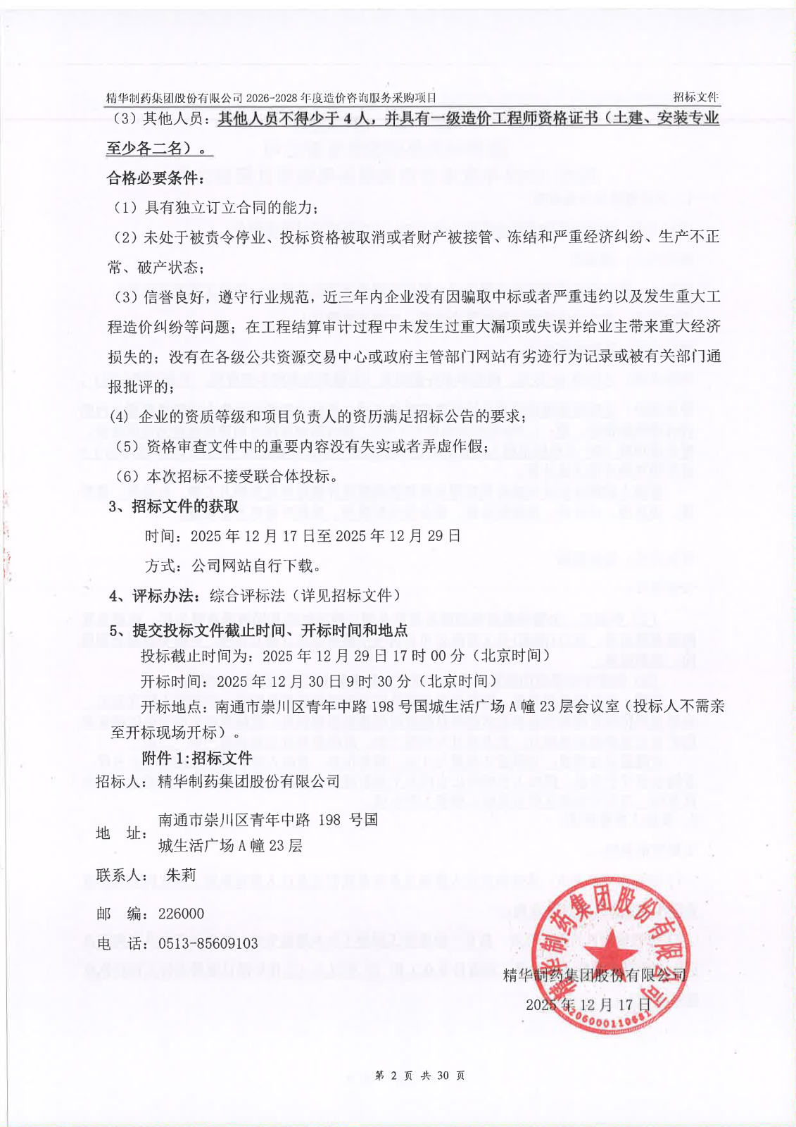 附件:精华制药集团股份有限公司造价咨询服务采购项目招标文件(2026-2028年)